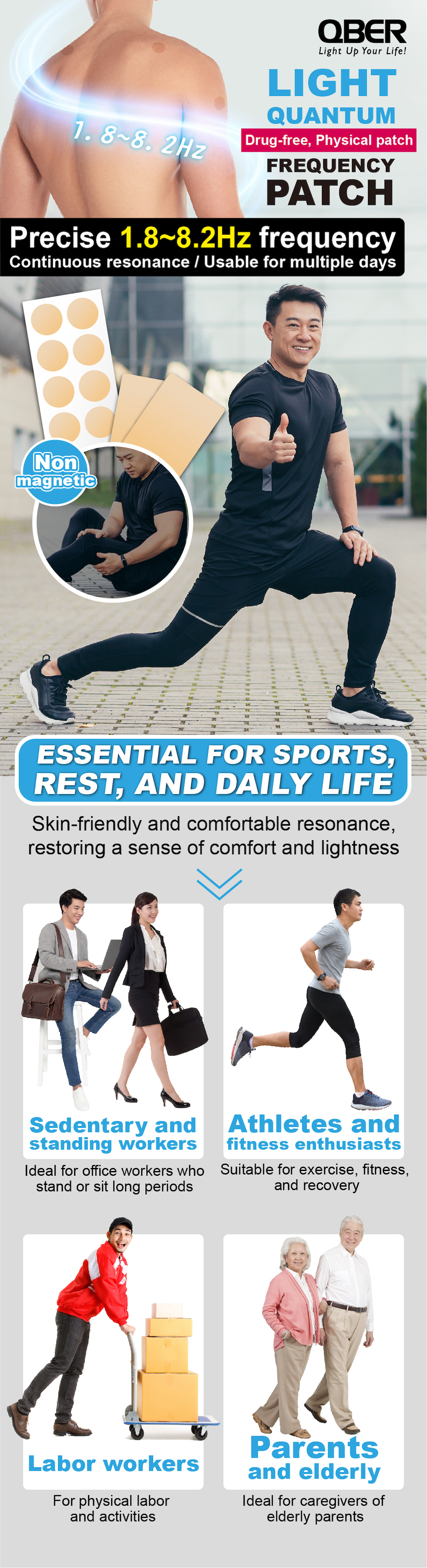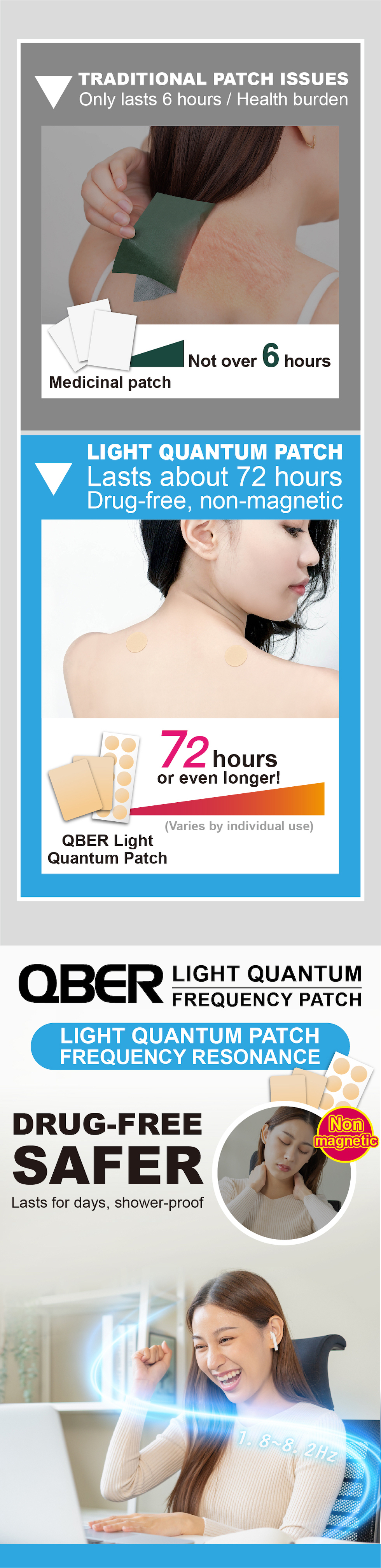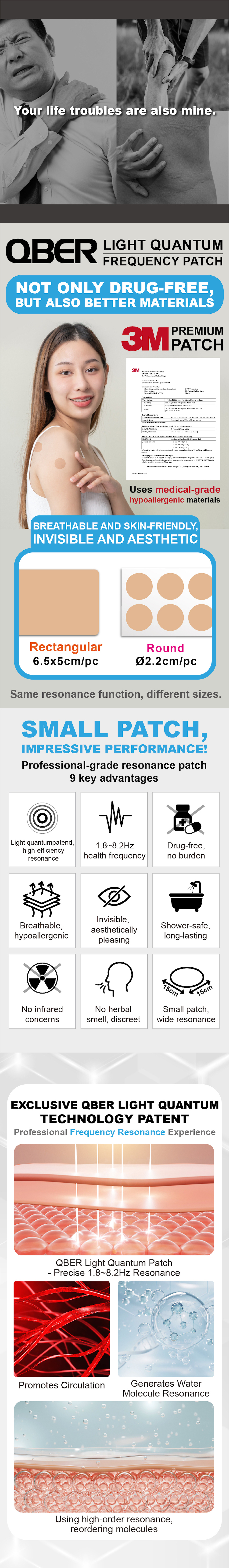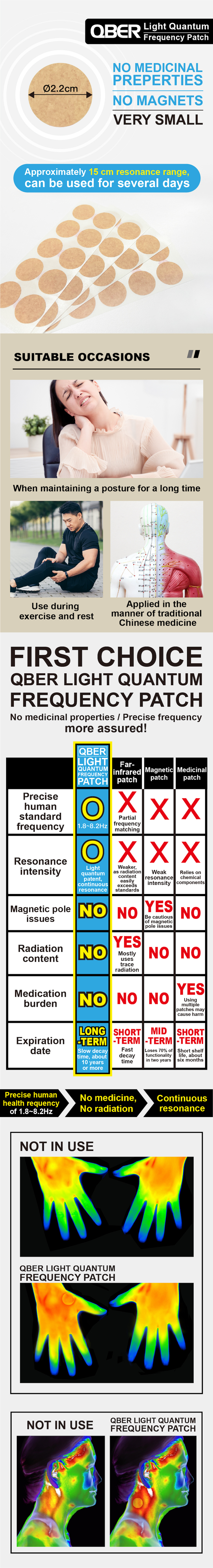 "QBER Light Quantum Frequency Patch" is made using the patented QBER Light Quantum Technology, based on the 1966 Nobel Prize-winning "optical magnetic resonance" principle. Russian scientists discovered that the precise human frequency is 1.8~8.2Hz, and QBER has embedded this frequency into the patch, making it a resonant patch, "QBER Light Quantum Frequency Patch," capable of releasing a precise 1.8~8.2Hz frequency with continuous resonance. It can be applied to shoulders, neck, arms, legs, acupressure points, etc. It is not far-infrared or titanium germanium and is free from radiation concerns. Exposure to sunlight and water does not affect its resonant function. Each patch lasts for 2-3 days and does not need to be removed for bathing.