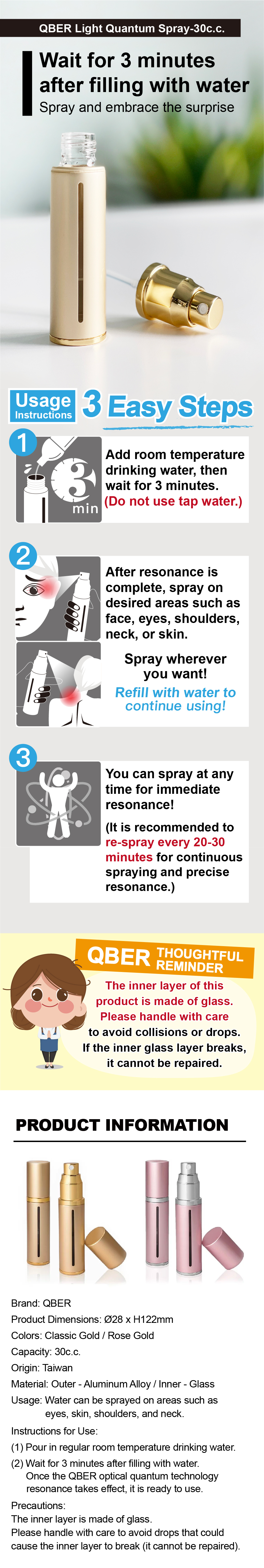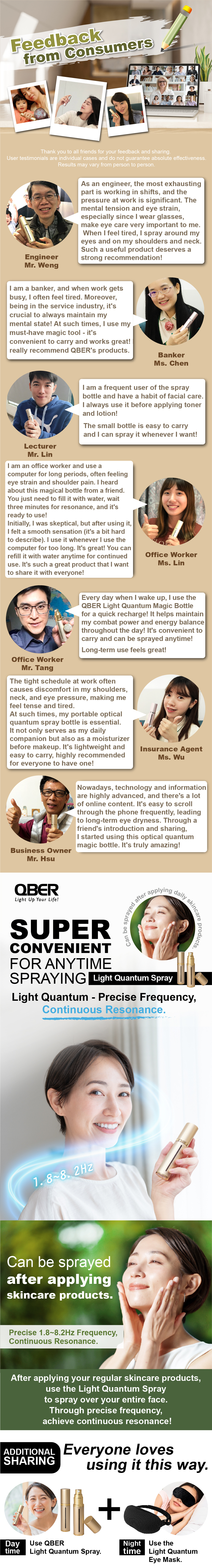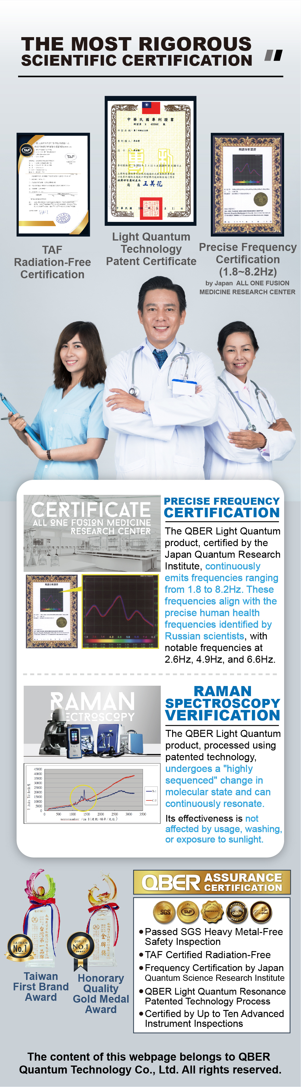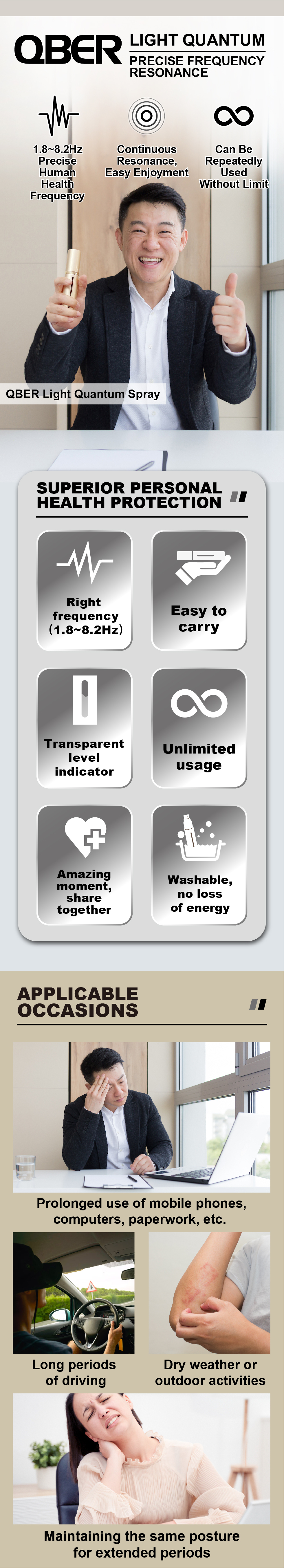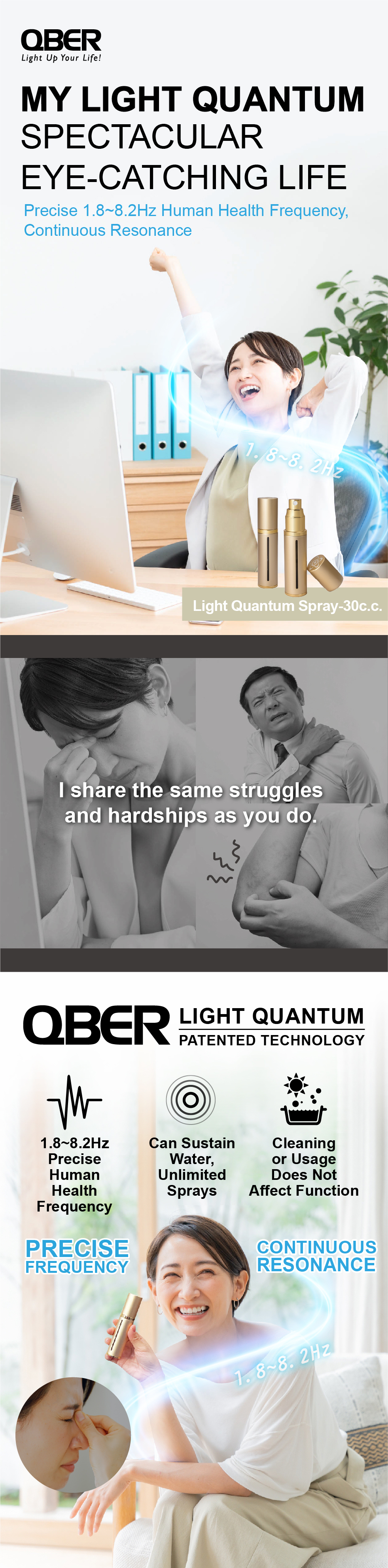 "QBER Light Quantum Spray" utilizes the national patent QBER light quantum technology process, based on the 1966 Nobel Prize principle of "magnetic resonance." Russian scientists have embedded the precise human frequency of 1.8~8.2Hz into the product, making it an energy product - the "QBER Light Quantum Spray." It releases a precise frequency of 1.8~8.2Hz for continuous resonance. It can be sprayed on the eyes, shoulders, neck, face, skin, etc. Unlike far infrared, titanium, and germanium products, there is no radiation concern. Sun exposure, washing, and usage do not affect its performance.